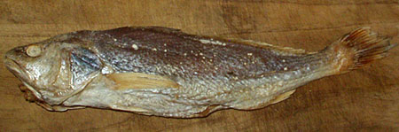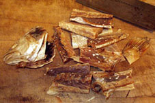 | なんじゃこりゃ深海魚の化石か、と思うかもしれないけど、これは広東の塩魚(咸魚)である。この前中華街に行ったとき、永年来探してきた塩魚をとうとう見つけたのである! 紙切れに「咸魚」と書いて、店から店へ渡り歩き、お店の人に見せて回ったら、とうとう数件目で当たった。店の奥から出してきてくれた。「長年探してようやく見つけましたよ!」と言うと「そうねえ、あまり無いからねえ。ところで前はどこで手に入れたの?」と聞くから「アムステルダムです」と答えたら、お店の人たちに大笑いされた(笑) そうだよね〜 |