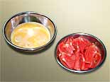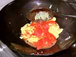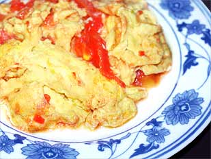 | 卵とトマトを最低限の調味料であっさりと炒めた料理である。調理のタイミングいかんで味が決まるので、コツをつかむことが大切である | ![]() |