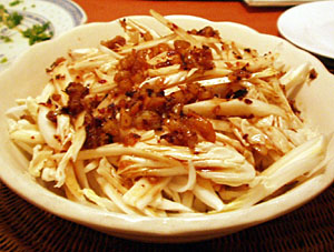 生白菜のサラダは、よく今どきの居酒屋で見かけるけど、作ってみるとなかなか旨い。さすがになんとなく、お客料理にはちょっと、という感じはするものの、家庭料理としてはとっても簡単で、おいしくて、何より安上がり |