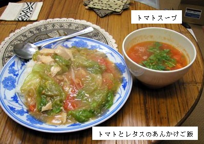 トマトがあったので、あんかけもスープもトマトで作った。トマトって高いんだよね〜。もっともたかだか三百円だけどね。いつも思うけど飲み屋に行けば三百円のつまみって最低線なのにね。スーパーに行くと別人だ(笑) |