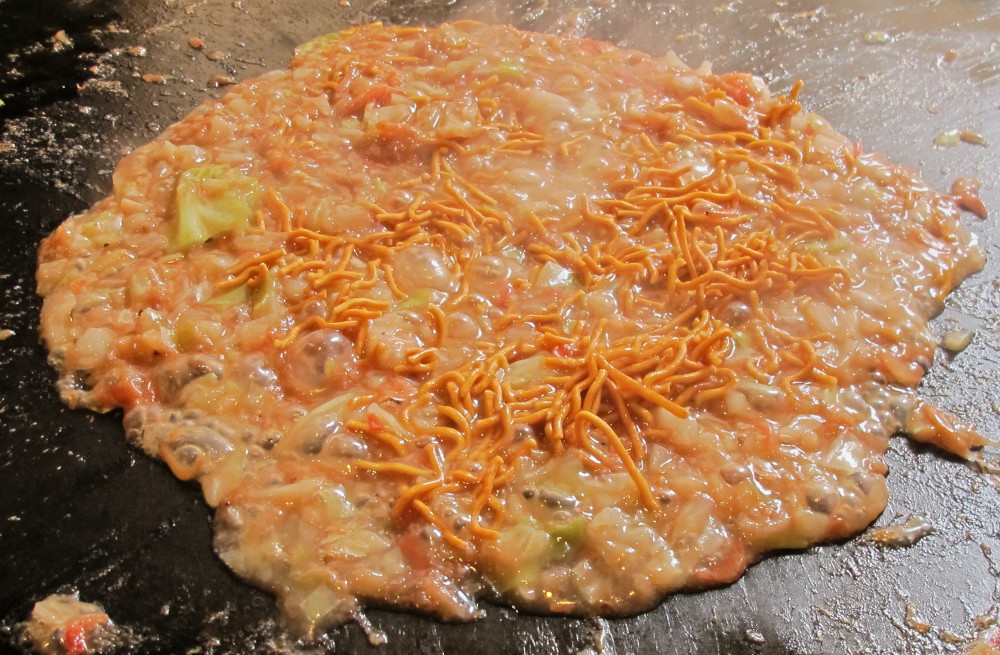 客はこれをスプーンなどでぐるぐるとかき混ぜ、熱した鉄板に油をひいてその上に流し入れ、両面を丸いパンケーキ状に焼き上げる。丸く形を整えたり、ひっくり返したりするときは、写真のような金属のヘラでこれを行う。