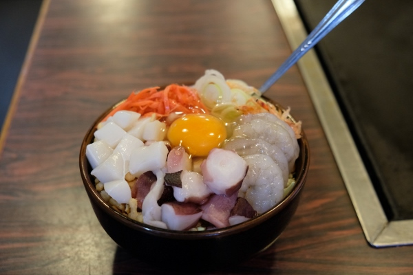 注文を受けると、この写真のようにご飯茶碗ていどの大きさの容器に具が入った状態で出てくる。基本的な内容は、小麦粉を水で練ったものに山芋のすりおろしと出汁などを入れたつなぎの上に、キャベツの荒みじん切り、天かす、さくらエビ、切りイカ、紅ショウガ、生卵などが乗っている。以上を基本の内容として、ここに注文の種類に応じて様々な具が入る。豚、イカ、などが入るが詳細は後述する。