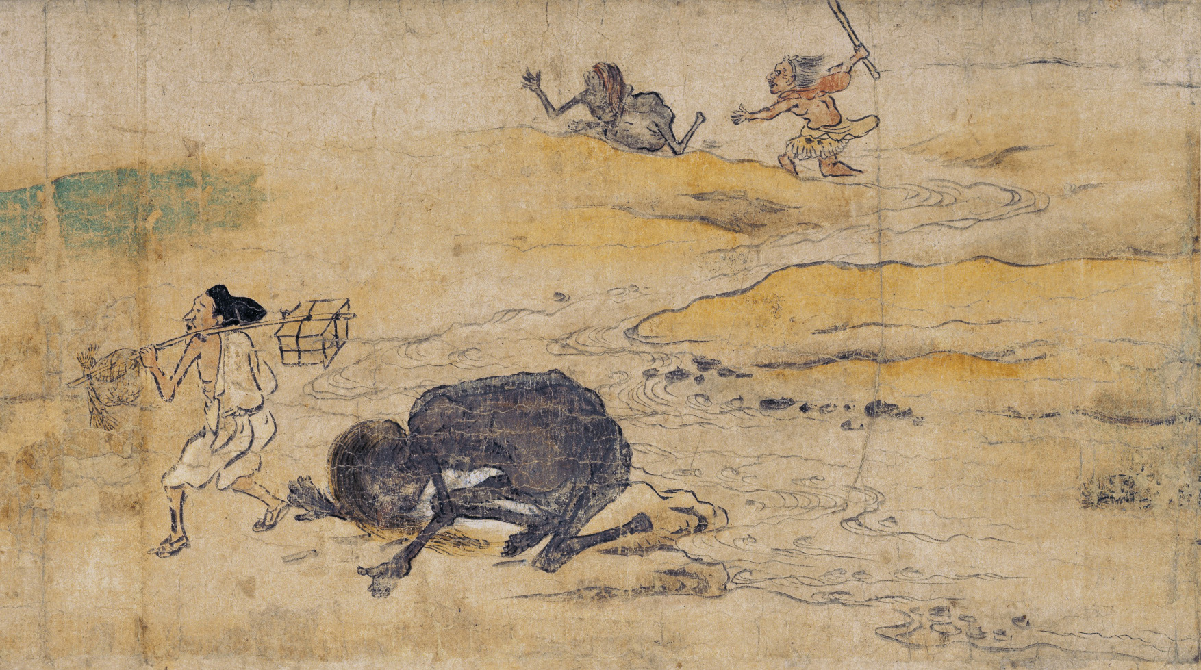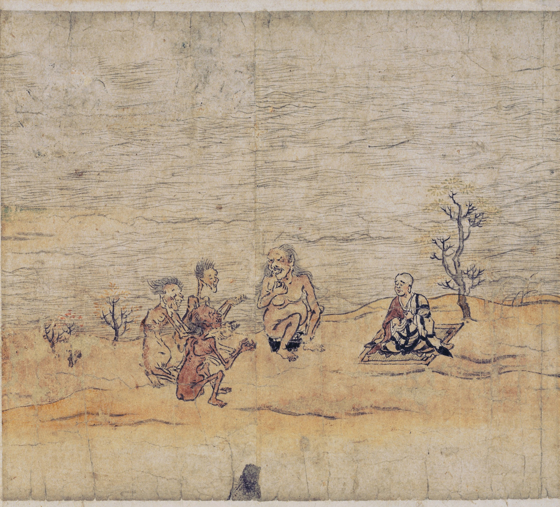 中央に川が蛇行していて、手前と向こうに餓鬼がいる。手前は旅人の後ろに這いつくばり、向こうの餓鬼は鬼に追いかけられている。詞書にはこうある。