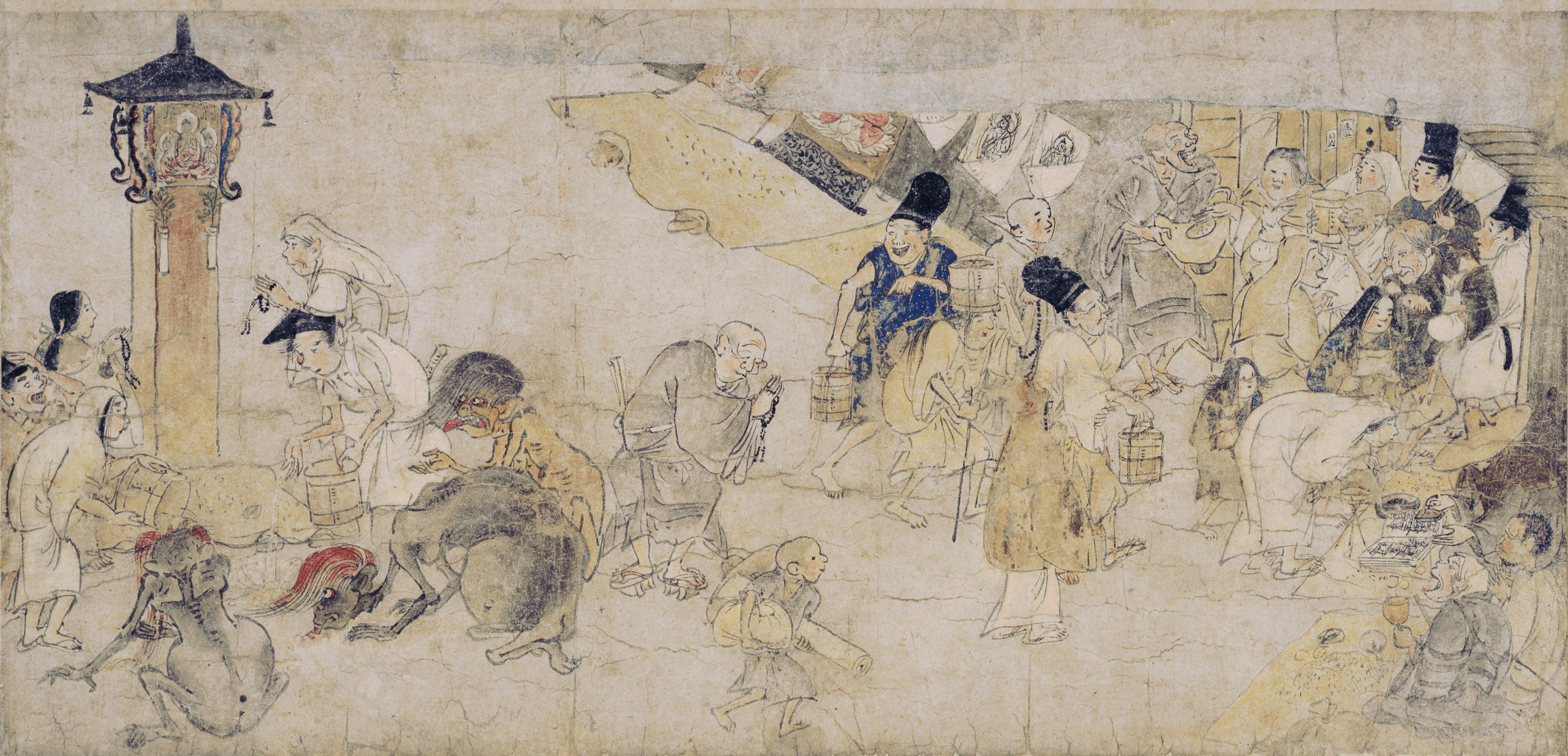 これはまたまことににぎやかな絵である。左に餓鬼はいるものの、なんと言っても、右側の道端の喧噪の描写が圧巻である。平安時代の人々のさわぎ声が聞こえて来るようだ。これらの人には餓鬼は見えない。これは何を描写しているのかは詞書でわかる。