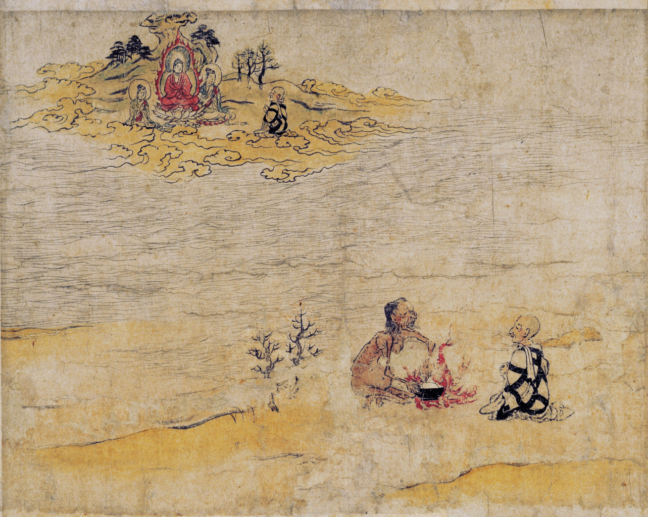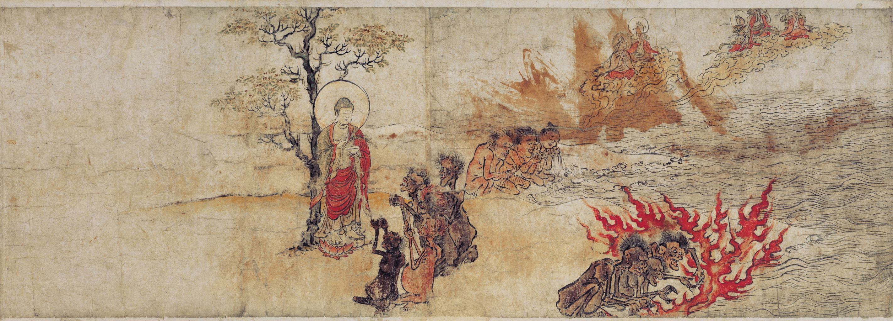 この絵は三つの順に起こる出来事が一つの絵の中に描かれている。右下に火に包まれた餓鬼がいて、左は佛に救けを求める餓鬼、そして真ん中上で餓鬼は人間の姿に変わり水が飲めるようになり、そしてそのまま右上の天上へと昇天してゆく。詞書にはこうある。