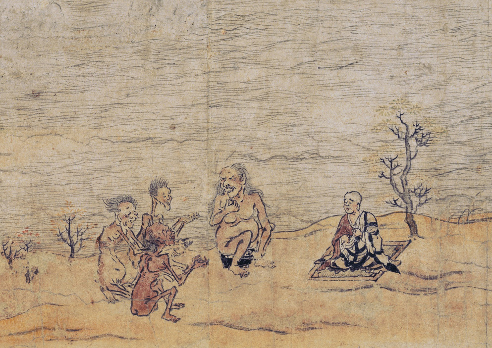 餓鬼は、つねに渇いているが、まっとうな水は飲めず、わずかに厳しく制限されたおこぼれの水が飲めるだけなのである。これは、お寺で行われる供養の日なのであろうか。市が立ち皆が楽しんでいるが、三匹の餓鬼はわずかな水を求めて必死である。供養の塔にみながかける水のおこぼれを長い舌でなめている。