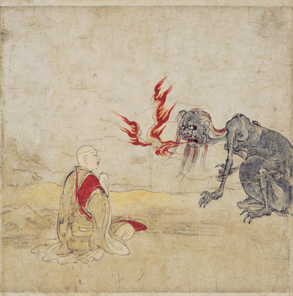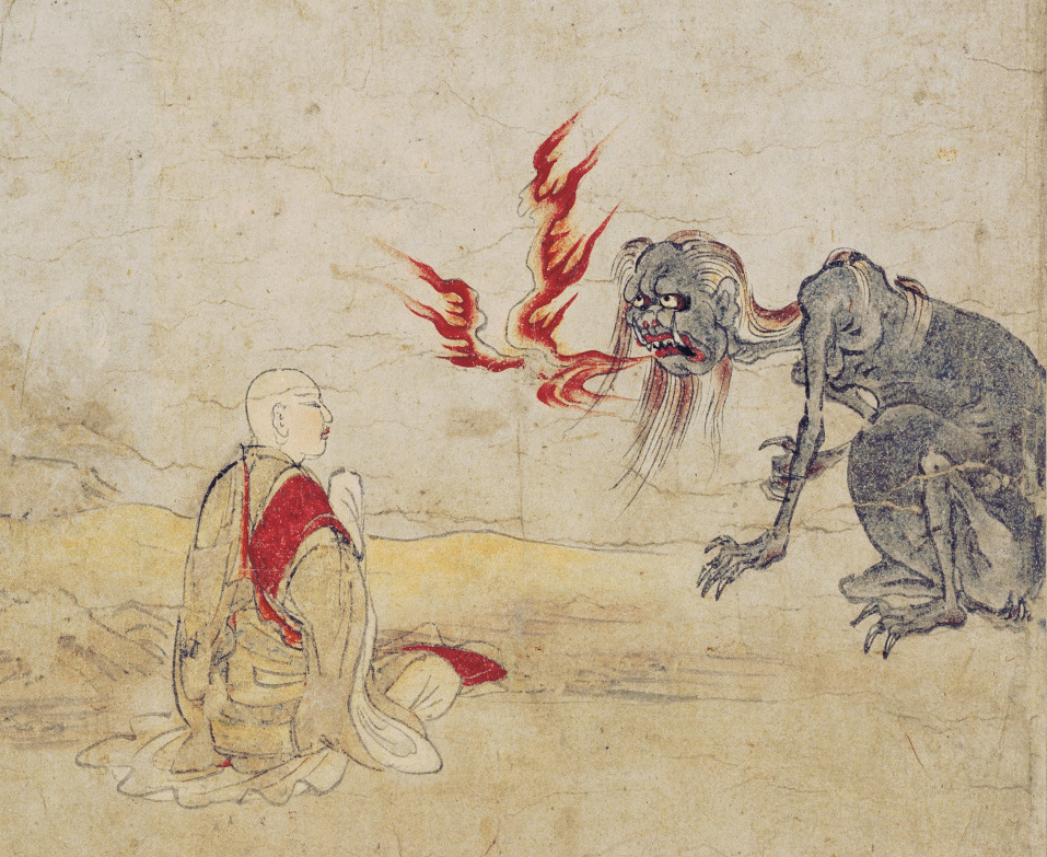 僧と大きな餓鬼が相対している。餓鬼は口から炎を吐き、苦しそうである。詞書にはこうある。