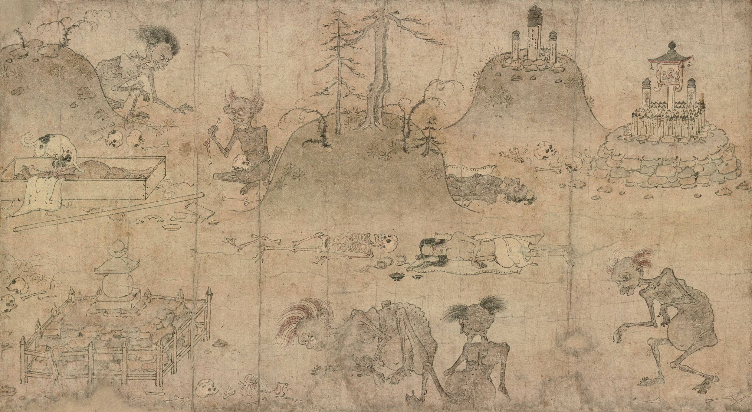 平安時代には、一般の墓地は山の中に共同墓地のような形で存在していたようである。ここでは、その墓地で戯れる餓鬼たちが描かれている。