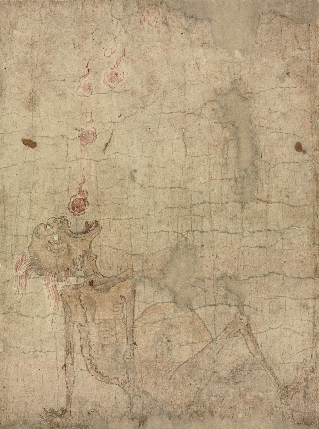 一匹の餓鬼が天に向けて大口を開け、上から次々と落ちて来る火の玉をまさに呑み込まんとしている。餓鬼は常に飢えと渇きに苦しんでいるが、その彼らが食物を食べたり水を飲もうとすると、それはすべて炎に変わってしまうのである。
