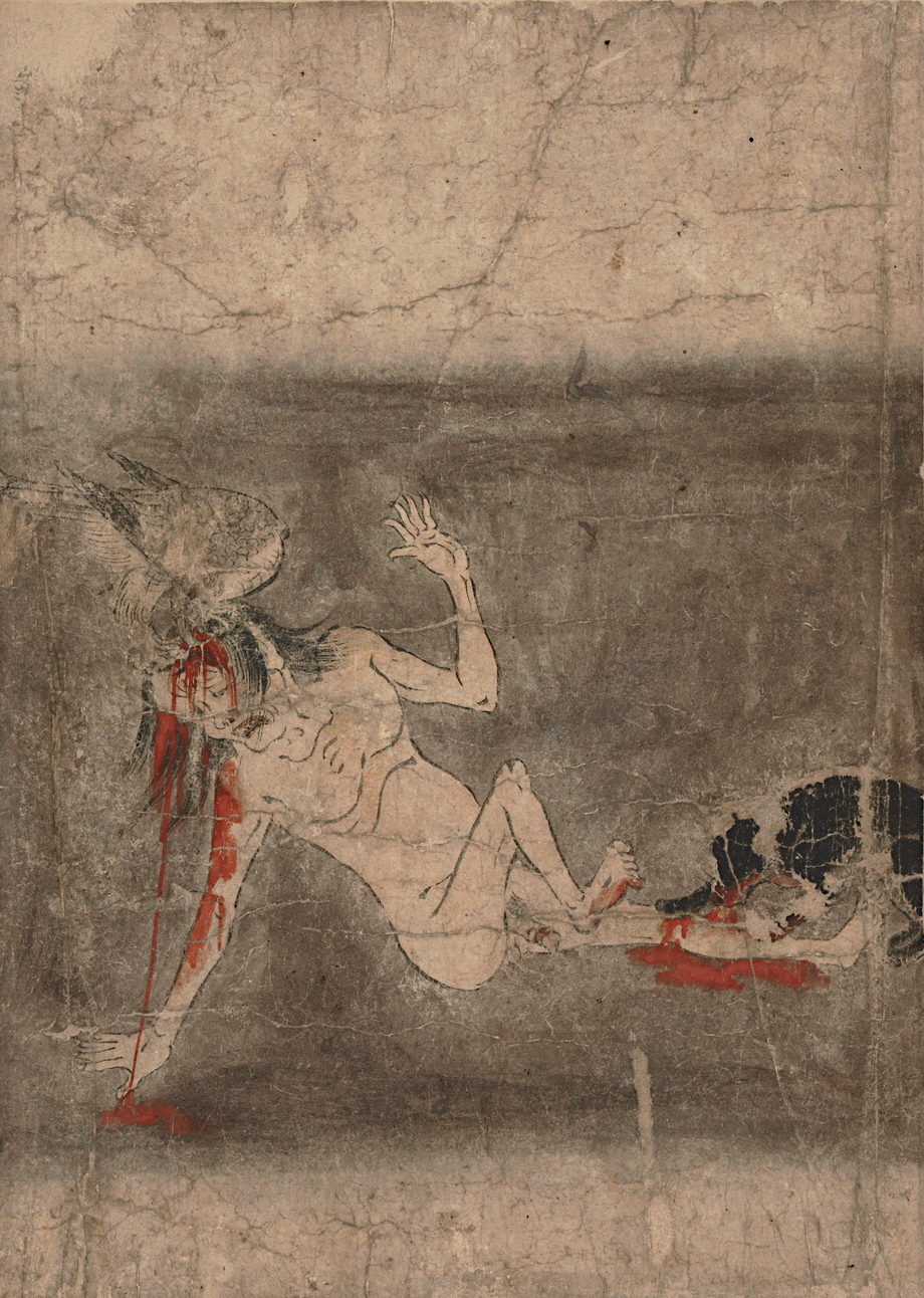 裸の男の左足に黒い犬が噛り付き、ざんばら髪の頭を鳥が突き、真っ赤な血が流れだしている。