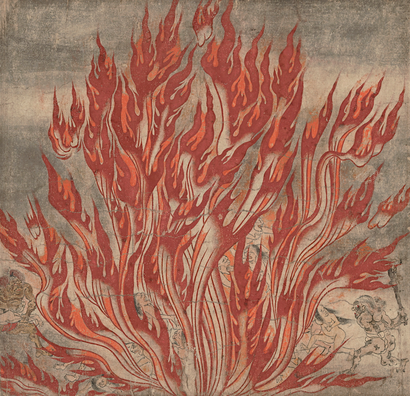 轟々と燃えさかる炎の中におおぜいの罪人がいて苦しんでいる。左の鬼は罪人の足をつかんで火へ投げ入れ、右の鬼は棍棒で火の中へ追い立てている。