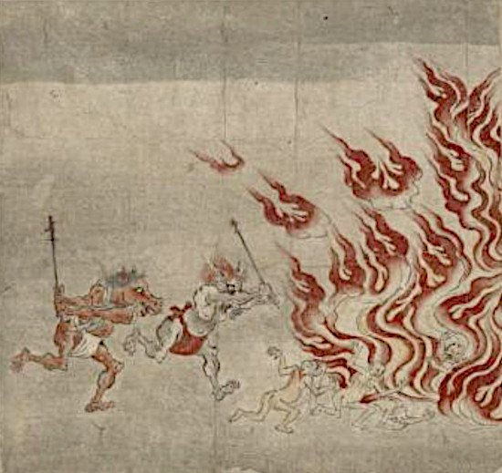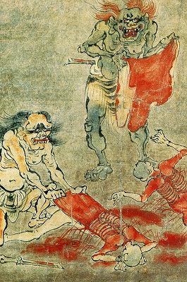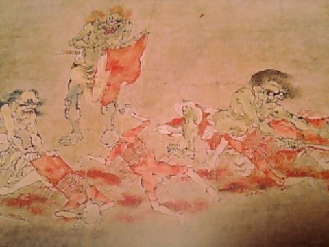 ここは、動物を殺して皮を剥いだりした僧侶が堕ちる地獄らしい。当時の僧侶に、そういうことをして皮を利用したり売ったりする輩がいたのであろうか。鬼たちが肉ごと背中の皮を剥ぎ、僧侶たちは血まみれで肋骨を露出させてうつ伏せに倒れている。なかなか凄惨な描写である。
