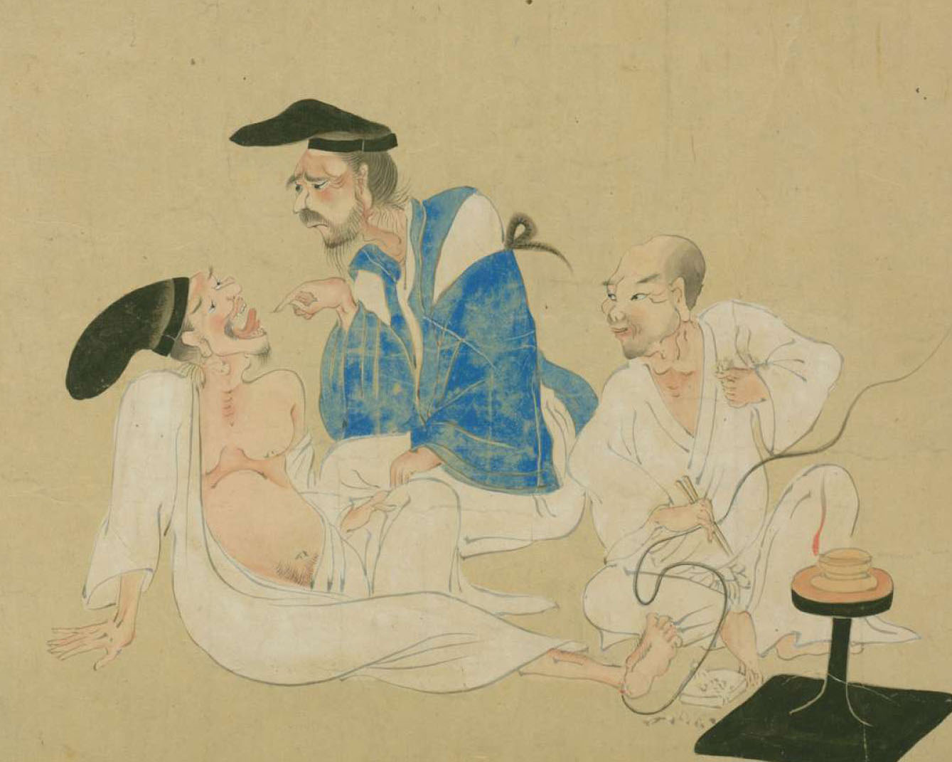 実はこれは、小舌の男の足首に灸を据えて、それが燃えて赤く、そこから煙が出ているのである。この坊主の左手の指の形を見ると分かるように、指でもぐさを丸めている。下の床に散らばってるのは、もぐさである。で、丸めたもぐさを箸で挟んで、火をつけて、それで灸を据えているのである。