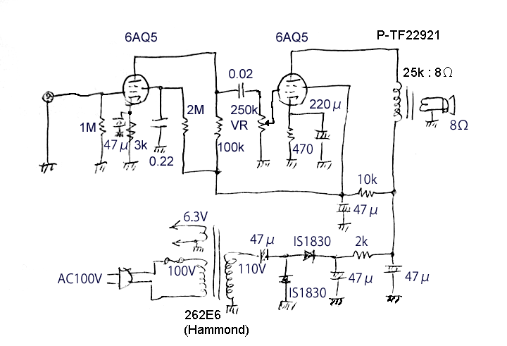 というわけで、その観点から見ても、6AQ5 – 6AQ5というのは素晴らしい並びでとても気に入った。パワー管をプリに使うのも面白い。というわけで、6AQ5を2本買うことにした。回路は、オーソドックスだけど、ほとんどFenderがまだFenderになる前に作っていたスティールギター用アンプを見習って、ボリュームもトーンも何にもないアンプにすることにした。音量はギター側で調整する。スイッチもなく、コンセントを入れれば音が出る。