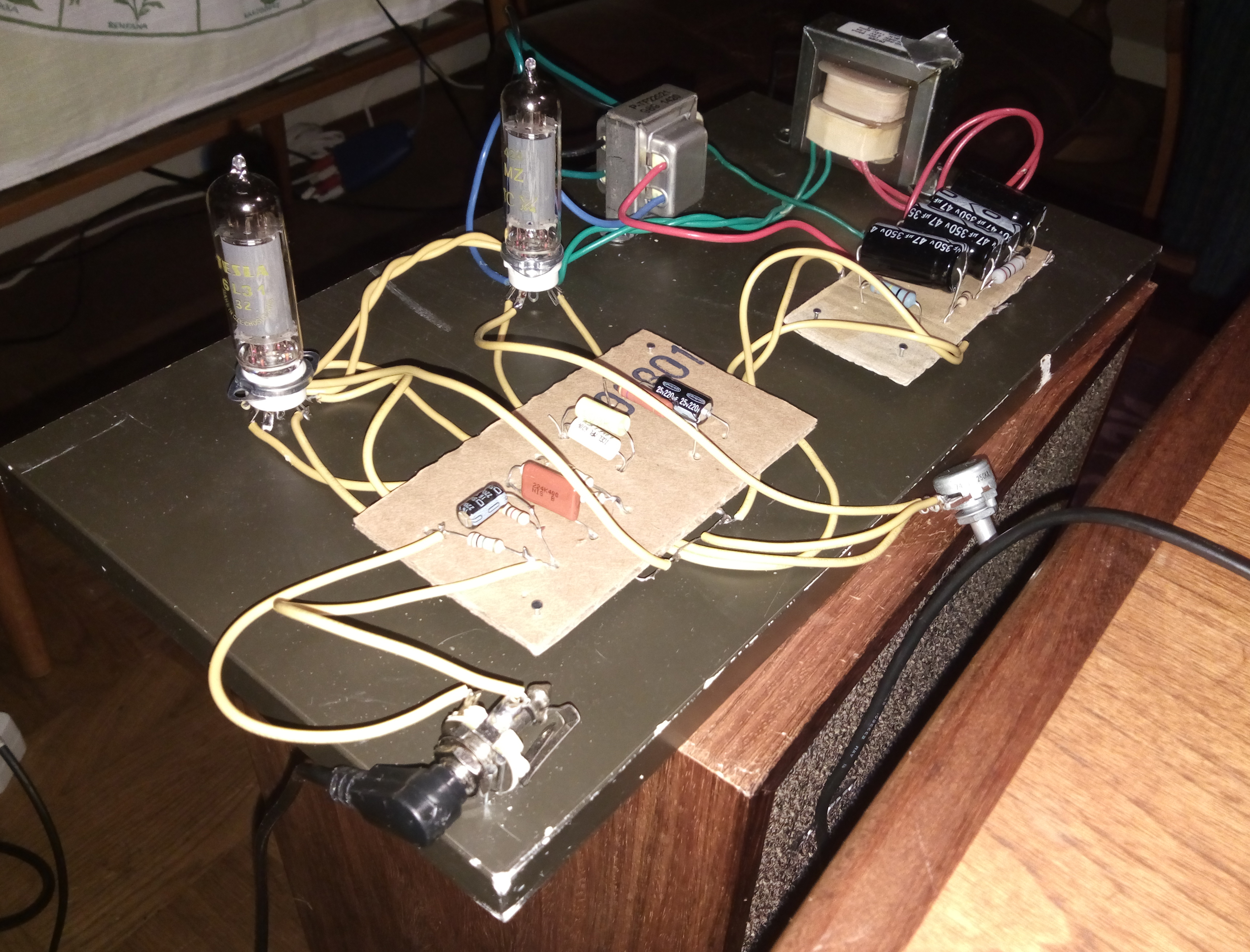 配線終わってエレキとスピーカーボックスつないでコンセント入れて、あっさり鳴るだろうと思ったら鳴らない。あれー? 電圧を測ってみると、初段のプレート電圧がほとんど0Vに近く、これじゃあ鳴らないはずだ。動作点がダメダメ。最初、グリッド抵抗に5MΩ入れてゼロバイスしていたのだが、バイアスがまともに動作してないみたいなんで、仕方ないんでゼロバイアス止めて普通のカソードバイアスにした。それでもプレート電圧あまり改善せず。うーむ。