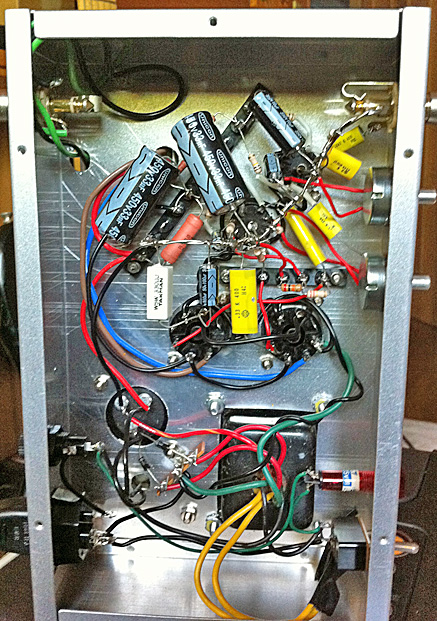 ただ、これってアース母線を張って、オーディオ的に最短配線になり、かつループ最小で配線した結果なのね。なので、よくある、「見た目は悪いけど味はいい」(笑)ってことになってるつもりです。つまり、オーディオアンプのノウハウで配線したギターアンプってこと。