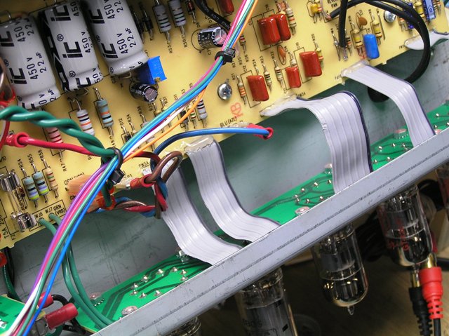 対処法は、基板から真空管ソケットに伸びているリボンケーブルの形状を変えることである。まだ、自分の写真を撮っていないのでBillmさんの写真を流用させてもらうが以下の通りである。