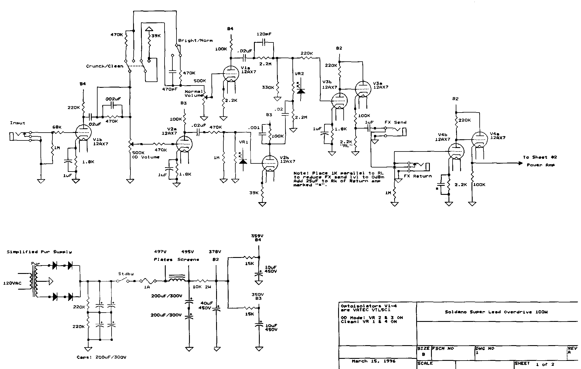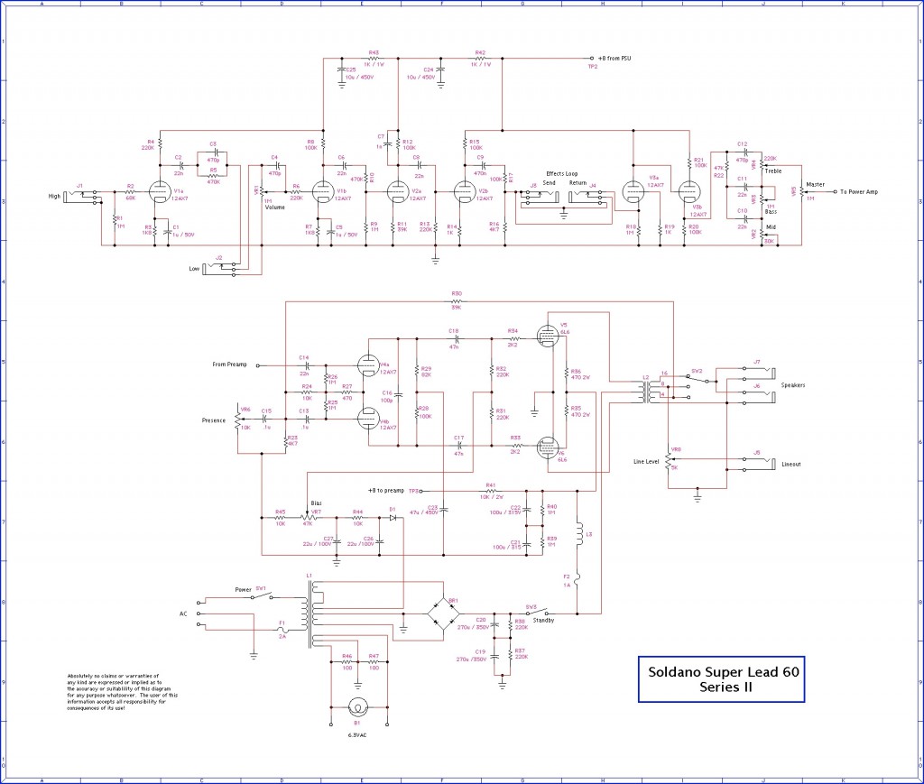 この回路を決めるにあたって今回参考にしたSoldanoのアンプは、「SLO-100」と「SUPER LEAD 60」の二つで、回路図は以下である。相変わらずでかくて見にくいが、後々のためにちゃんと載せておく。図をクリックして行けばオリジナル解像度で見られる。