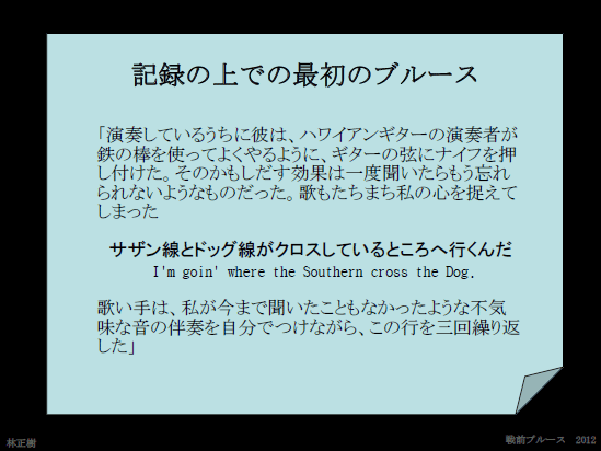 「演奏しているうちに彼は、ハワイアンギターの演奏者が鉄の棒を使ってよくやるように、ギターの弦にナイフを押し付けた。そのかもしだす効果は一度聞いたらもう忘れられないようなものだった。歌もたちまち私の心を捉えてしまった。