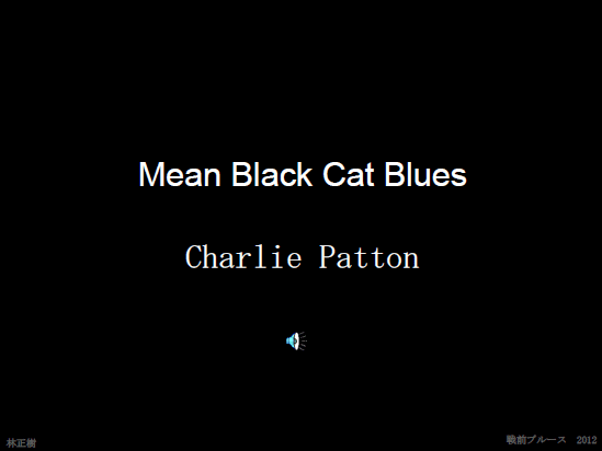 これはチャーリー・パットンが生ギターを弾きながら歌っているいわゆる弾き語りです。ギターはオープンチューニングでスライドバーか、あるいはナイフを使って歌のメロディーとユニゾンっぽく弾いてますね。歌詞は、女を猫にたとえて、いやな黒猫が俺のベッドの周りとうろついてる、とか、ドアを引っ掻いてる、とか、こんな猫に悩まされてるならいつか朝になったら殺してやる、とかそんなようなことを歌っているようです。