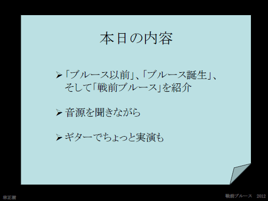 僕はギター弾きなんで、実は実際のレクチャーでは少しだけギターを使って戦前ブルース奏法なんかの解説をしました。でも、今回、それもまた別立てでね。