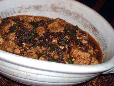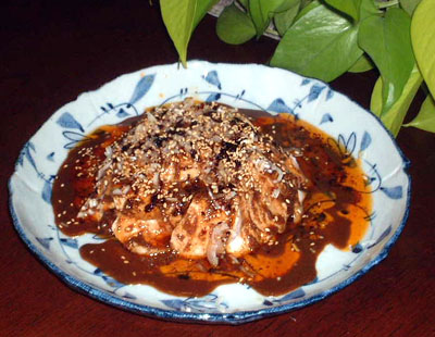 ◆鍋に、ショウユ大3、老酒大2、砂糖大1.5、酢大1を入れ、火にかけ、2,3分煮る。熱いうちにニンニク1かけとショウガ1かけをすりおろして入れ、芝麻醤大1.5を入れ、まんべんなくかき混ぜる