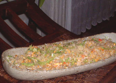 ◆魚肉を油通しする。キュウリとセロリを軽く炒め、熱湯を杓子一杯さし、塩を入れ、1分ぐらい煮て水を切る