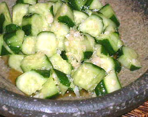 ◆塩小1/2、砂糖小1/2、老酒小1/2、化学調味料少量を入れ、キュウリを入れ、からめる