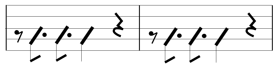 そう。上記タブ譜の赤い音符、「fell down on my knee」の「down」は16部音符が一個分、後ろにずれているのである。いわゆるシンコペーションである。で、この時の「fell down on」の3つの音のリズムに注目して欲しい。これは、譜面に書くと
