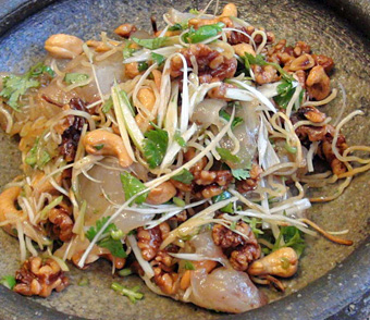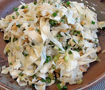 湯葉のネギショウガ油あえ ネギとショウガのみじん切りに塩とショウユを入れ、そこに熱い油を注いで作ったネギショウガ油が決め手の料理です。このネギショウガ油、実は香港の大衆食堂へ行って蒸し鶏乗せご飯を頼むと必ず小皿に入って出て来るものです。白くて柔らかい香港の蒸し鶏はすごくおいしいんですが、この小皿の油が得体が知れず、ずっと不思議でした。あるとき香港出身の周富徳がテレビで種明かししていて、なるほど! と真似して作ったらこれがおいしいんです。たぶんどこの国の料理もそうだと思うんですが、現地の人が日常的に食べている大衆料理はけっこうレシピブックの選外になっていて、作り方はその国の人しか知らなかったりするんですよね。面白いですね。 → レシピはこちら |