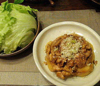 鶏肉の蒸しものレタス添え 蒸した鶏肉とジャガイモをレタスに包んでいただきます。40分ほど中火で蒸すんですが、鶏肉は柔らかく、ジャガイモはねっとりした感じになり、美味です。調味料を計量して入れて作れば誰でも簡単に作れるのでお勧めです。今回、最後に全体に四川省の粒山椒を挽いた粉をかけて中国らしさをプラスしています。鶏肉は、牛肉や豚肉で、あとジャガイモの代わりにカボチャを使ったり、いろいろバリエーションを増やせます。 → レシピはこちら |