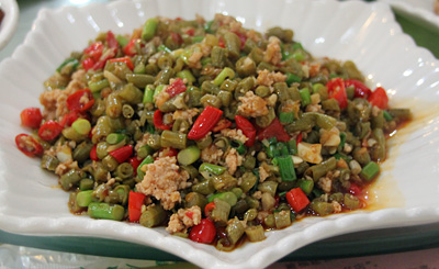 さて、このいかにも家庭料理っぽい炒めものだが、劉さんはこの料理が一番好きなのだそうで、これがあればご飯を何杯でも食べられる、とのこと。豚のひき肉と、赤いトウガラシと、青いトウガラシ、そしてニンニクの芽みたいなものを細かく切ったものを炒めたもの。かなり辛くて、かなり酸っぱい。しかし、これは劉さんの言うとおり、本当にうまい。辛くて酸っぱい料理の傑作だ。これ、なんとか再現できないだろうかと思い少し調べてみたら、どうやらニンニクの芽に見えたのは、ササゲという野菜を酸味が出るまで発酵させた漬物のようだ。そっか、酸味の漬物はいろいろあるので近いものは作れるかも。