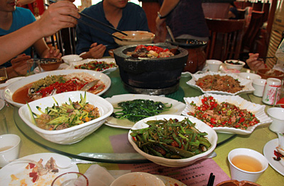 厦門での仕事でずっとお世話になった劉さんは湖南省の出身。厦門ではもっぱら現地の料理を食べていたのだが、オフの日に出かけたとき、劉さんが故郷の湖南料理を食べさせてあげる、ということで入ったのがこのお店。湖南省といえば、四川省の少し南にあり、辛くて酸っぱい料理で有名である。四川料理の好きな自分としては、やはり湖南料理は興味津々で。もう喜んで劉さんについていって、今回、本物のそれをたらふく味わってきた。お店はどこぞの繁華街の中にあって、活気があって騒々しくて楽しい庶民的な感じのところで、僕らが入った昼時は人でいっぱいであった。