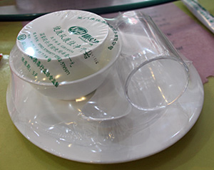 ところで、店に入るとこんな風に一人分の食器がセットになって出てくる。面白いよね。それでビニールをバリバリって破ると、ゴミは床にポイと捨てちゃう。いいねえ、中国ノリ!