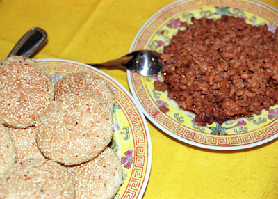 最後はこれも有名な北京の古い料理で、焼餅(シャオ・ピン)と炒肉末(チャオ・ロウ・モウ)である。まんべんなく白ゴマをまぶして焼き上げた焼餅に、豚肉をショウユ味で炒めたそぼろをはさんで食べる。