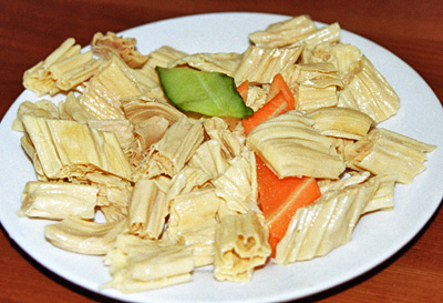 そして湯葉のあえもの。中国産のあの馬鹿でかい乾燥湯葉を戻して切って、薄い塩味であえてある。見てのとおり、まったく変哲のない料理なのだけど、歯ごたえのある大陸の湯葉を噛んでいるとけっこう楽しい。以上、味付けなどもそっけなく、ほとんど素材の味のみといった感じである。