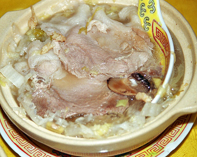 お次は、このお店のハイライトかもしれない、沙鍋下水(シャ・グオ・シャ・シュイ)である。本によると、豚の心臓、肝臓、肺、胃、腸、膵臓の6つの内臓を大なべで水煮して作ったものだそうである。内臓が嫌いな人には地獄のような光景だが、いろんな内臓それぞれの独特の味と、香りと、歯触りが楽しめてすばらしい。もっとも、ここまで内臓だらけだと、さすがにばくばく食ってると気持ち悪くなってきたのは確か。でも内臓が平気な人にはぜひ、お勧めする。