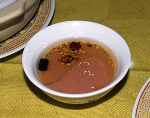 はじめは豚の薄切りを白菜や干しシイタケと一緒に土鍋で煮込んだもの。柔らかくて、当然ながら豚の味がふんだんにして、旨い。スープもおいしいが、中の具を一緒に出てくる次のようなタレにつけて食う。