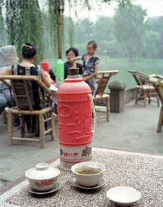 茶館はお茶を飲むところで、町中の至る所に見つかり、成都の人達のお茶好きがうかがえる。 ここは人民公園の中の野外茶楼である。注文すると、お茶の葉が入ったアルミのふた付きの茶碗と、熱湯の入ったポットが出される。腕に熱湯を注ぎ入れ、ふたをして、お茶の葉が沈むまで待ってから、静かにすすって飲む。お茶が無くなればさらにお湯をそそぎ入れる。ゆったりした良いところである。粗末な竹の椅子もなかなか座りごごちが良い。