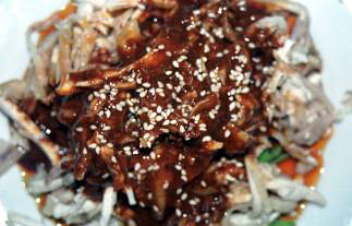 同じく陳麻婆豆腐店で注文した棒々鶏(バン・バン・ヂー)。このバンバンジーも日本で有名な四川料理のひとつであろう。本場のものは日本のものに比べてタレの色がかなり黒い。これは主に使われているショウユの違いから来る。日本でいうと名古屋付近で使われているたまり醤油に近いものを用いていて、ショウユを使った料理はいずれも仕上がりが日本のものより黒い。このバンバンジーであるが、かかっているタレは、日本のもののようにゴマだれという印象は皆無で、これぞ四川の味と言えるような複雑な調合がなされた得体の知れないもので、実に強烈で、旨い。ここにも山椒粉が入っている他、漢方薬のような香りもほのかに漂っている。一方、鶏の方は、水煮して冷まして細く裂いたものだが、日本の柔らかい鶏に比べて、しっかりした歯ごたえがある。