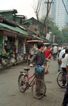 成都は近代的な都市であった。高層ビルもかなりの数建っており、街全体も広い。しかし、ビル沿いの大通りから一本道を中に入ると、突然、五十年前かと思わせるようなひどく古びた長屋街のようなものが現れる。2階建ての家が道沿いに連なり、1階部分は店舗になっていたりするが、2階部分が廃墟のように崩れかけた家も多い。車も走ってはいるが少ない。歩きと自転車、そして町じゅうでお目にかかる後ろに二人がけの座席を付けた自転車タクシーが走っている。この自転車タクシー、ちょっと見ると昔の人力車にも見え、それも手伝って、路地を入るといきなり何十年もタイムスリップしたような感じを受ける。
