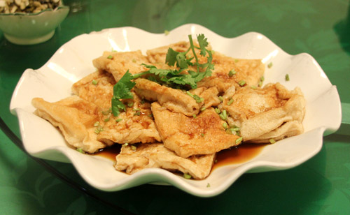 お次は、いわゆる厚揚げをさっとショウユ味に炒めたこれ。厚揚げといっても豆腐をその場で揚げて、それに少し甘辛いショウユ味のタレでからめてある。あっさりした家庭の味で、おいしい。