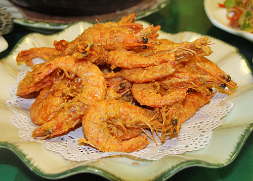 エビの変わり揚げ。聞いたところだと表面には鹹蛋(シェ・ダン)の黄身がまぶしてあるらしい。ちなみに鹹蛋は、卵を濃い塩水に長期間つけて作ったもので、お粥のおかずなどにして食べる中国食品である。月餅などのお菓子にも使ったりする。その独特の味が揚げエビと相まって、変わったおいしさである。