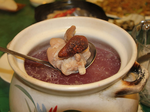 さあ、こちらも今日のハイライトの一つ、赤キノコと豚足の煮込みスープ。写真に写った赤黒い感じのものが、おそらく紅菇(ホン・グゥ)と呼ばれる赤い乾燥キノコで、その下にあるのが豚足のぶつ切りだ。紅菇はスープに入れるとスープを赤く染めるそうで、見てのとおり少し紫がかった赤でとてもきれい。スープのお味はこれまたあっさりとしているけどしっかりしたダシ味で、すばらしい。アモイの料理はこういう蒸しスープが特徴のようである。すべてのスープが違うダシを使っていて、感心する。そういえば、かの、有名な高級蒸しスープ料理の佛跳牆(フォー・ティャオ・チァン)は福建料理の代表だもんね、納得。