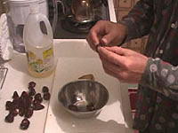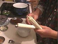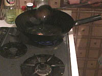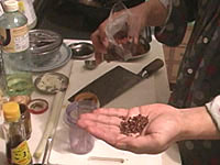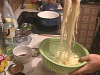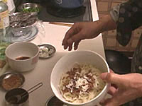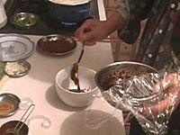 花椒(山椒のこと)は、トウガラシと並んで四川料理の必須アイテムである。日本の山椒と風味は異なり、口に入れると舌をビリビリとしびれされる働きをすることが特徴である。四川人はあのしびれる感覚が好きらしい。ここでも是非、中国の花椒をミルで挽いた粉を使いたいところである。日本の、あの、うなぎにかけたりする粉山椒では、かなりいただけない。 作り方 1)ネギショウガを切る ![]() ネギは荒みじん切り、ショウガはみじん切りにする。 2) 挽肉を炒める ![]() 中華鍋をよく空焼きして、挽肉とショウガを入れ、杓子の背で挽肉つぶしながら、ほぐし、パラパラに炒める。中華なべの空焼きについては「麻婆豆腐」の項を参照のこと 3) 挽肉に味をつける ![]() 挽肉によく火が通って、油が澄んだ感じになってきたら、ショウユ大1、酒大1を入れてさらに水気がなくなるぐらいまで炒めて火を止め、皿にとっておく。 4)ショウユと芝麻醤を混ぜる ![]() ショウユ大1と芝麻醤大1/2をボールに合わせて粒がなくなるまでよく混ぜ合わせておく。ショウユと芝麻醤が2対1の割合である。芝麻醤は冷たいと混ざりにくいので、ちょっと暖めるとよい。 5) 花椒を挽く ![]() ホールの花椒をミルで粉状になるまで挽いておく。 6) 麺をゆでる ![]() 細うどんの乾麺を、表示どおりの時間ゆでる。 7) 調味料を合わせる ![]() うどんをゆでている間に調味料を合わせる。一人前の小碗を用意し、ここに、ショウユと芝麻醤を混ぜたものを大2/3、ラー油を大1、ゴマ油小1、花椒粉小1/2を入れておく。 8) 麺の水切り ![]() 麺をザルに上げ、水洗いしてぬめりをとる。このとき、水でやってもいいが、麺がちょっと暖かい方がおいしいので、自分は、湯沸かし器のお湯でもみ洗いして麺の温度があまり下がらないようにしている。洗ったら、水気を切る。 9) 麺を入れて仕上げ ![]() 調味料の上に麺を入れ、麺の上に炒めた挽肉大2とネギの荒みじん切りを乗せて出来上がりである。このまま上卓し、食べるときめいめいが全体をよく混ぜ合わせてから食べる。 本場風の辣油の作り方 材料と調味料