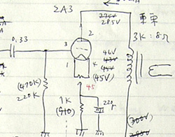 回路は例によってオーソドックスである。なんと言ってもオーセンティックなブルースバーには、オーソドックスな古典回路だろう、ということで、自己バイアスの直熱管シングル、負帰還はもちろんなし、ドライバとの結合はふつうにCR結合、そして電源には手持ちの整流管5AR4を使って、チョークはやめておいて、緑色のでかいホーロー抵抗を使ってみることにした。電源トランスは、2A3シングルステレオだと電流容量がぎりぎりなのだが、ジャンク箱に転がっていた傷だらけのやつを使った。2.5Vのヒーター電圧は無いので、これだけはネットで探して通販で購入した。一応、設計段階の手書きの回路図をここに載せておく。