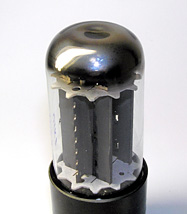 それから、真空管を外から見ると、右の写真のようにガラス管の内壁の一部が銀色に光っている。これは真上だったり、下のほうだったり色々である。これはゲッターと呼ばれ、ガラス管内の余計なガスを吸着する物質が吹き付けられているのだ。製造直後に管内に残っているガスを吸着するほか、長年使っているうちに電極などから放出されるガスが真空度を下げないように吸着する役割をする。なので、このゲッターが薄くなって半透明になっていたりしているときは、真空度が下がって特性が劣化している疑いがあることが、外から見てわかるのだ。アンプの何かのトラブル、たとえば真空管に過剰な電流が流れたりすると、たいていこのゲッターが半透明になっているので分かったりする。半透明になってしまったものは、たとえ音が出ても使えない、と判断した方がいい。