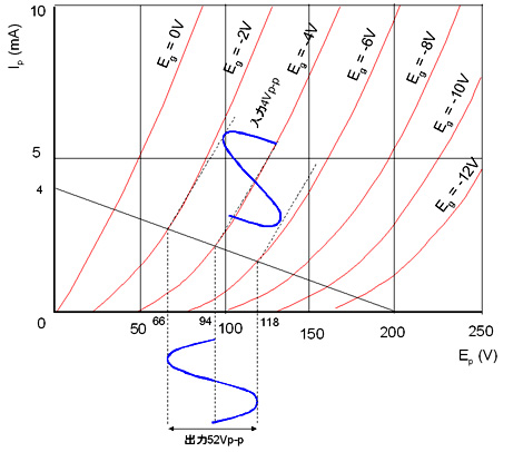 ちなみに「バイアス」というのは、真空管ギターアンプでよく聞く言葉であろう。「バイアス調整」っていう、アレである。上の例ではバイアスを-4Vにしたが、図を見ると例えばこれを-2Vにしても-8Vにしても、だいたいうまく増幅できそうに見える。ただ、あんまりバイアスを0Vに近くして、極端に言うとバイアスをかけないでゼロにしてしまうと信号の片側がプラスの領域に入ってしまい、グリッドにプラスの電圧がかかってしまう。これについてはこの次で説明するが、あまりよろしくない(増幅しないわけではない)。逆に、バイアスを極端に例えば-12Vとかにしてしまうと、全体がずっと右側に寄ってしまい、増幅率もかなり小さくなってしまうし、何より4Vp-p以上の信号が来たら右側の余裕もなくなり歪んでしまう。結局、バイアスはこの図の真ん中あたりにしておくのが良さそうだ、というのが直感的に分かるであろう。バイアス調整というのは要は、これをやっているのである。なぜバイアス調整で音が変わるのかというと、上述のように歪み方がいろいろ変わったり、増幅率が変わったりするからである。