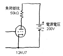 と計算できる(ちなみに、オームの法則は上の式のように、mAとkΩで計算するようにすると便利である) 電源電圧は200Vなので、この電圧はすべて抵抗の両端で使われてしまい、プレート電圧Epは0Vになる。そこで、このIp