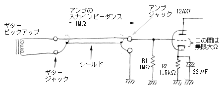 ここで、図のようにギター側から見たアンプ側のインピーダンスをアンプの入力インピーダンスという。この回路の入力インピーダンスはいくつかというと、真空管のグリッドとカソード間は電流が流れないのでインピーダンスは無限大で、この1MΩの抵抗がそのまま入力に入っていることになるので、この回路のアンプの入力インピーダンスは1MΩということになる。